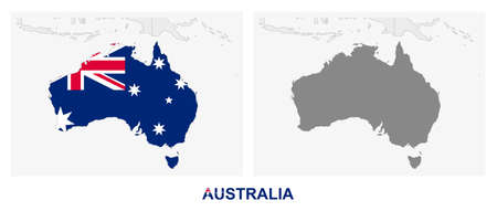 Two versions of the map of Australia, with the flag of Australia and highlighted in dark grey. Vector map.