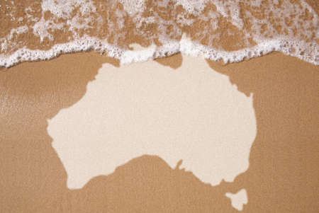 Nice, pleasant and simple sunny summer composition on holidays. Happy relaxing vacations. Text words on wet sand on beach, concept of Australia