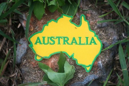 “Australia†eco patch with map embroidery placed on a stone amid natural foliage. A calm travel scene perfect for environmental tourism and green adventures.