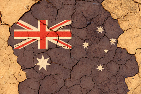 ecological concept. Drought. On dry, cracked ground, the image of the flag of Australia.