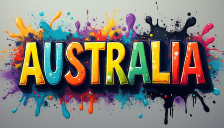 This eye-catching graffiti artwork boldly displays the word AUSTRALIA in a playful, colorful font, surrounded by vibrant paint splashes. The lively colors and dynamic design evoke a sense of energy and creativity, celebrating the spirit of Australian culture and art.