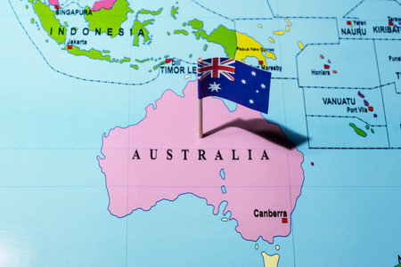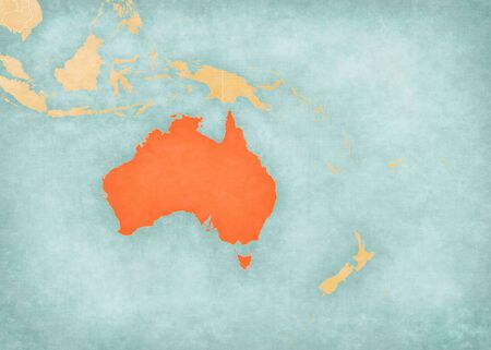 A map of Australia with an Australian flag on it. The flag is blue with white stars. Travel and government concept