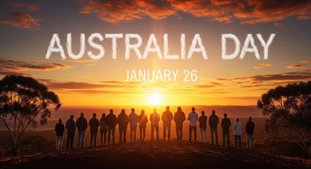 A group of people stand silhouetted on a hilltop, gazing towards a breathtaking sunrise over a vast landscape. The sky is ablaze with vibrant orange, yellow, and red hues, with dramatic clouds. The sun is low on the horizon, casting a warm glow. The words AUSTRALIA DAY are formed by clouds in the sky, and JANUARY 26 is displayed below. The scene evokes a sense of national pride and contemplation.