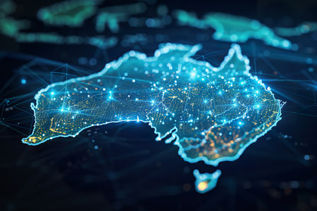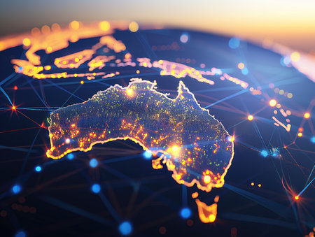 A glowing map of Australia with vibrant orange and blue lights