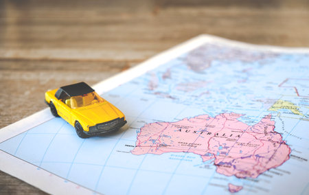 geographic Australia map with yellow convertible car