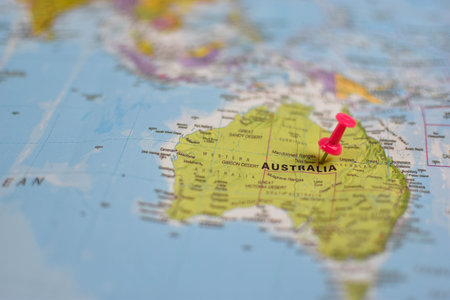 Australia pin on a world map. Australia travel destination planning pinned