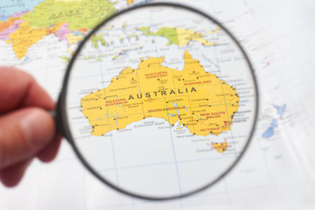 A person's hand holds a magnifying glass over a colorful map of Australia, clearly showing its states and major cities during a study session on geography and travel.