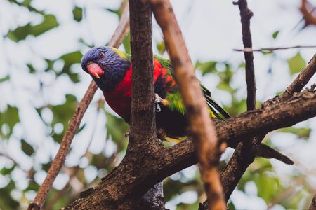 Lorius lory sitting on a tree branch with sunshine pouring overhead. Close up of a tropical bird in natural conditions.