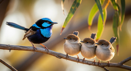 A vibrant blue parrot perched on a branch, surrounded by warm light and soft, out-of-focus foliage in the background.