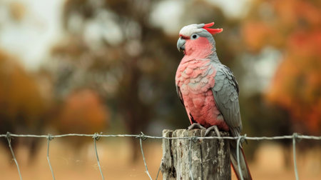 A pink and gray Galah bird is sitting on top of a weathered wooden post. The bird is perched and observing its surroundings.