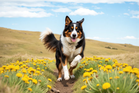 Portrait of a border collie dog running in the field with yellow flowers