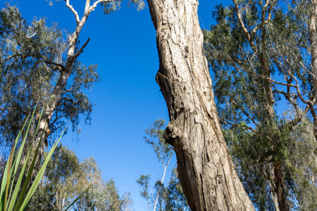 Under a bright azure sky, a towering eucalyptus tree rises amidst lush greenery, showcasing its textured bark and sprawling branches. The tranquility of nature envelops the scene.