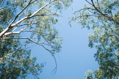 Looking up through a tree canopy into blue sky in a forest of gum trees in regional Australia