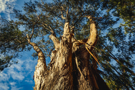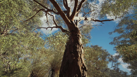 Standing tall in a sunlit forest, a magnificent eucalyptus tree showcases its intricate bark and sprawling branches. The vibrant sky enhances the tranquil atmosphere of this natural setting.
