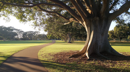 A large, leafy tree in a spacious park, with a gently curving empty pathway leading into the distance.