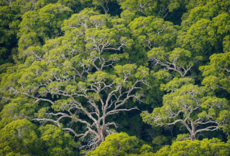 Birds eye view of a sprawling old tree providing shelter and food for various bird species.. AI generated.