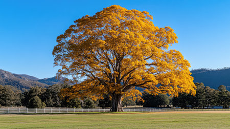 A vibrant maple tree in full autumn color stands tall and proud on the lawn of an empty parking lot, surrounded by white fences. The clear blue sky above creates a striking contrast between the green grass underfoot and the bright yellow leaves on the trees. This photo captures a lone but colorful scene that stands out against its surroundings. --chaos 30 --ar 16:9 --v 6.1 Job ID: a0a3804a-47e4-4010-8af7-ff5c1cb6d6bd