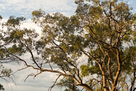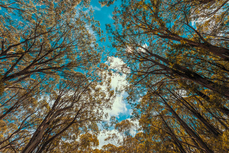 Majestic eucalyptus trees standing tall against a vibrant sky, creating a tranquil and timeless natural scene, low angle view