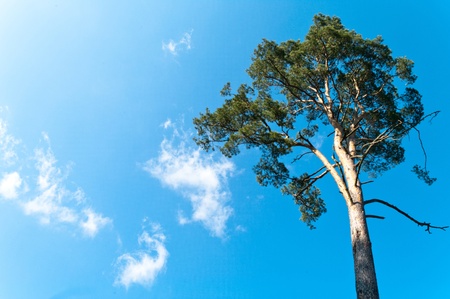 Bottom view of the tree top. Shot from below against the blue sky with the sun.