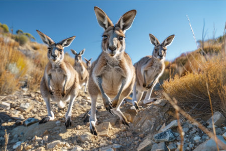 A group of kangaroos hopping across the rugged terrain of the Australian outback under a clear blue sky.. AI generated.