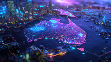 Discover a stunning aerial view of Australia, showcasing vibrant neon lights illuminating the cityscape at night. A captivating blend of innovation and beauty.