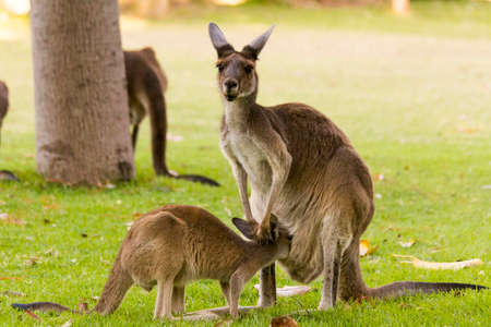 Beautiful kangaroo feeding its baby outdoors Perth, Western Australia, Australia