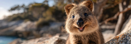 A cute quokka displays a joyful expression while perched on rocky terrain near the coast, under a clear blue sky and warm sunlight.