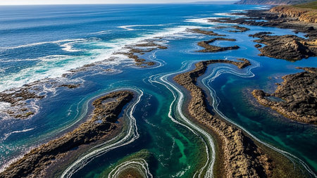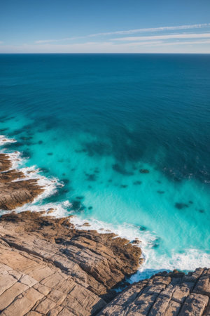 Ocean showing aerial view of a rugged rocky coastline with turquoise and deep blue ocean water and white waves. resolution use.