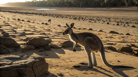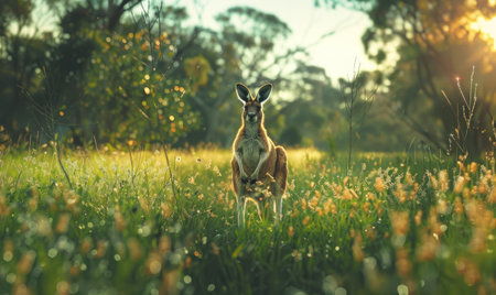A kangaroo in natural habitat with warm sunlight filtering through trees. generate AI