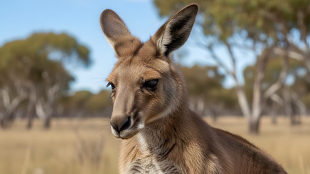An intimate portrait of a kangaroo, focusing on its alert expression and soft brown fur against a blurred outback background. The image captures the unique features of this iconic marsupial in its natural habitat.