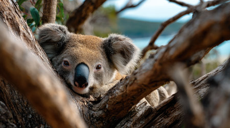 This enchanting image captures a sleepy koala nestled among tree branches in its natural habitat, showcasing its serene beauty and wildlife charm.