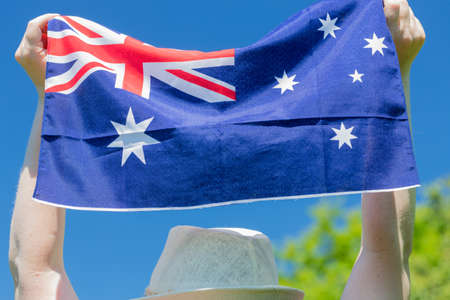 National flag of Australia. Country outline on white background with copy space. Politics illustration.