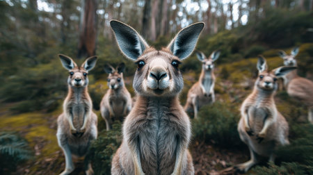 Several kangaroos are standing in a lush green forest setting. The sun filters through the trees, creating a serene atmosphere. These animals appear curious and alert.