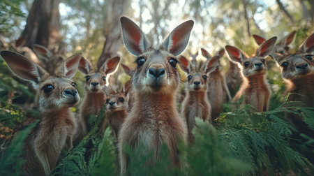 A large group of kangaroos stands amidst the greenery of a dense forest. The sunlight filters through the trees, illuminating their fur as they gather in their natural habitat.