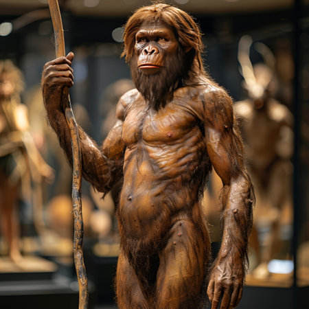 This detailed figure illustrates a prehistoric humanoid standing confidently with a wooden stick in a museum setting. The exhibit highlights the evolution of man and ancient lifestyles..