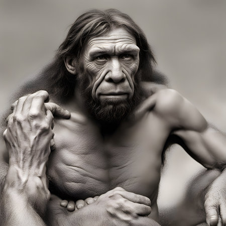 A close-up, lifelike reconstruction of a male Neanderthal. The detailed portrait shows a thoughtful expression, with warm light highlighting his hair and features.