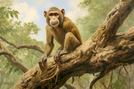Proconsul prehistoric primate in its natural, lush, and forested environment. Fossil Evolution ancestor of Homo sapiens. Artistic representation generated with AI, not a scientific reconstruction