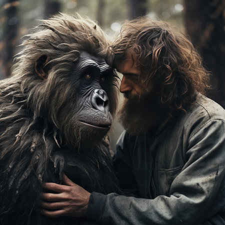 Face to face between a man and a monkey. A man with a beard and mustache and a monkey, seen in profile looking at each other and comparing. On a blurred natural green background. Generative Ai.