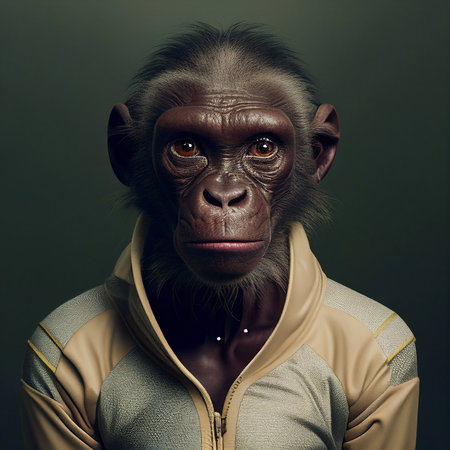 Portrait of a chimpanzee monkey in a yellow jacket on a dark background