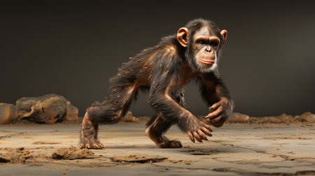 a chimpanzee, depicted in a black foreground, walks on the ground. this photo captures the essence of iconic pop culture references and precisionist style, reminiscent of the graflex speed graphic era. rendered in cinema4d, the image showcases a national geographic-like quality, with a punctuated caricature of the chimpanzee. ai generated