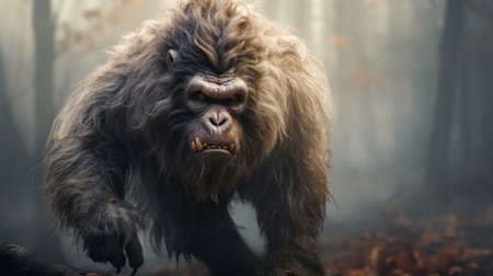 a gorilla with long hair and tusks walks through a forest in this zbrush-style spatial concept art. the scene features spiky mounds, a mix of dark and light white tones, and is rendered using unreal engine 5. the gorilla's strong facial expression adds to the pop-culture-infused atmosphere. ai generated