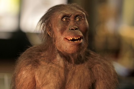 A detailed exhibit showcases a realistic portrayal of an early human ancestor with distinct features and fur set in a naturalistic background.