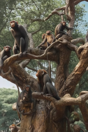 An AI generated illustration of A loving mother monkey and her four cubs are perched together on a log, enjoying a peaceful moment in the outdoors