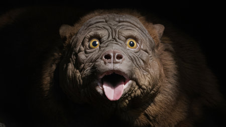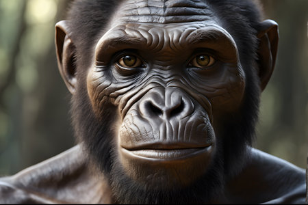 An AI generated illustration of a close-up portrait of a black monkey against a dark background