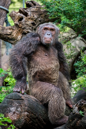 A chimpanzee gazes thoughtfully into the distance, its expressive face and deep eyes reflecting a moment of contemplation.
