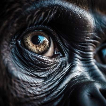 Close-up of a gorilla's captivating amber eye, showcasing the intricate details of its iris and surrounding fur