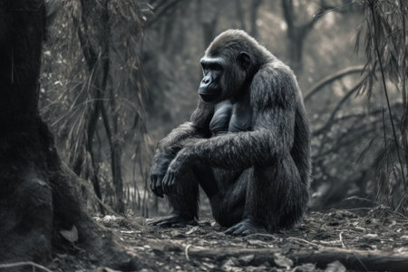 Thoughtful Gorilla Portrait Close-Up on a Dark Background, Blending Animal and Human Emotions