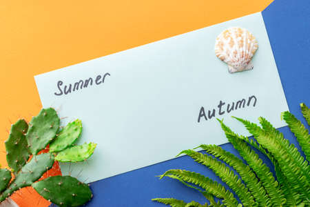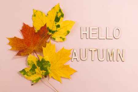 Hello autumn -text and autumn leaves on a pastel background. Autumn backgroun