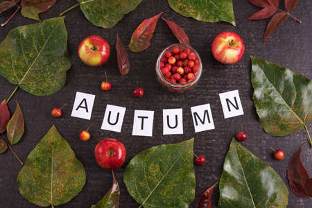 Autumn letters with yellow and red leaves and fall fruits. Minimal flat lay creative concept. Autumn composition. Dried leaves on background.