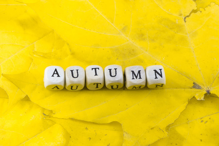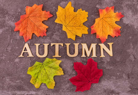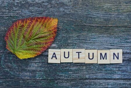 dry colored fallen leaf and the word autumn from wooden letters on a gray board